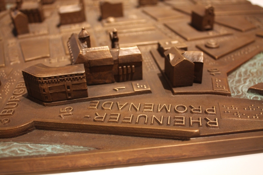 Diese Tafeln wurden im Sandguss hergestellt. Die Gebäude wurden in Wachsausschmelzverfahren hergestellt und anschließend mit der Platte verschweißt. Die besondere Schwierigkeit liegt in der genauen Abbildung der Braillschrift um die Lesbarkeit für Blinde zu gewährleisten.