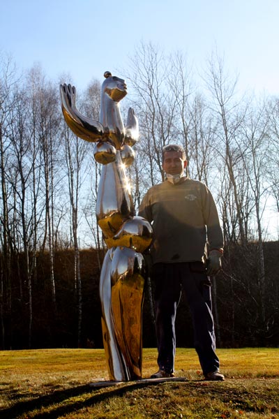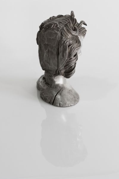 Die Skulptur ist aus 999 Feinsilber gefertigt. Durch Patinierung wird eine unterschiedliche Farbgebung erzielt. Von Galerie Bullion Art, Künstler Emanuel Basler,