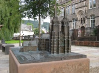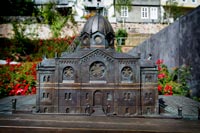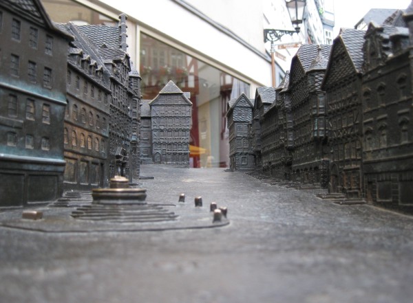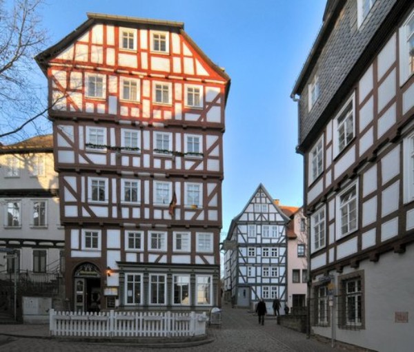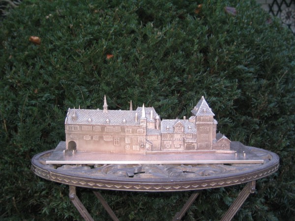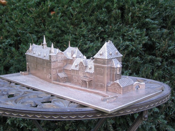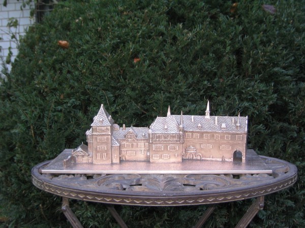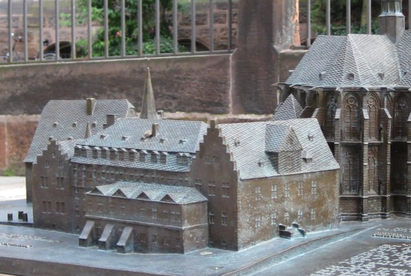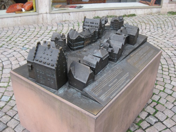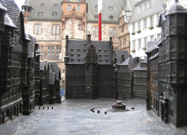 Der historische Marburger Rathausplatz stellt das Zentrum des beliebten Altstadtkerns dar. Das Modell wurde im Maßstab 1:125 gefertigt. Die Grundplatte des Modells ist 120 x 80 cm groß und beinhaltet die verschieden historischen Gebäude in unterschiedlichen Baustilen. Auf einem Foto ist das Marburger Rathaus sowie dessen Modell zu sehen.